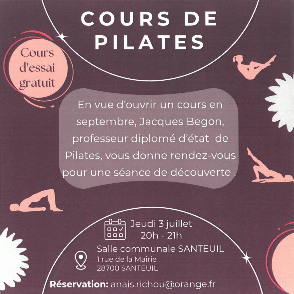 Nous avons le plaisir de vous inviter à une séance d’essai de Pilates qui se tiendra à la Salle Communale de Santeuil le jeudi 3 juillet, de 20h à 21h. Cette initiative vise à vous faire découvrir les bienfaits de cette discipline, qui allie renforcement musculaire, souplesse et bien-être.
