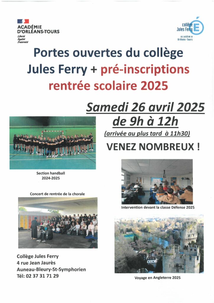 Le 26 avril de 9H 12H venez aux portes ouvertes du collège Jules Ferry d’Auneau.
